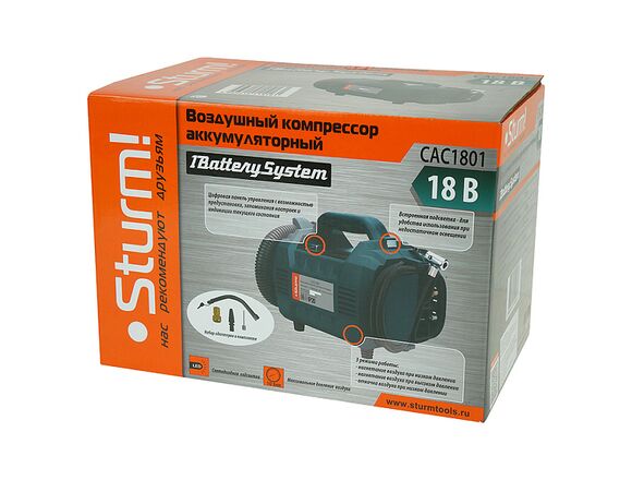 Аккумуляторный компрессор является частью системы 1BatterySystem. 1BatterySystem - универсальная аккумуляторная система. Подходит ко всей линейке аккумуляторного инструмента Sturm!