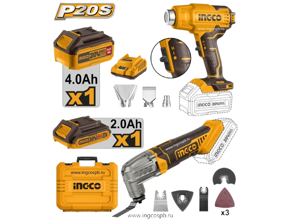 Набор "АКЦИЯ" INGCO 20V MAX фен + реноватор, АКБ 2Ач + 4Ач, ЗУ, насадки КЕЙС