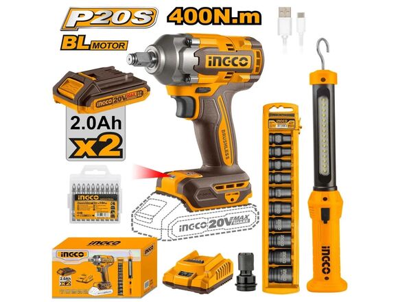 Набор Б/Щ "20V MAX" INGCO гайковерт удар 1/2" 400Нм + фонарь + удар.головки 10шт, 2АКБ/ЗУ (1/4)