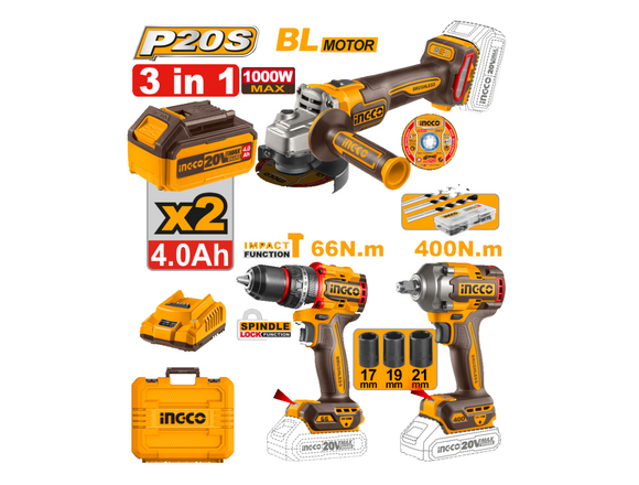 Набор "АКЦИЯ" Б/Щ INGCO "20V MAX" 3 в 1 шуруп удар 66Нм+гайковерт 400Нм+УШМ 125мм, 2АКБ+ЗУ,КЕЙС(1/4)
