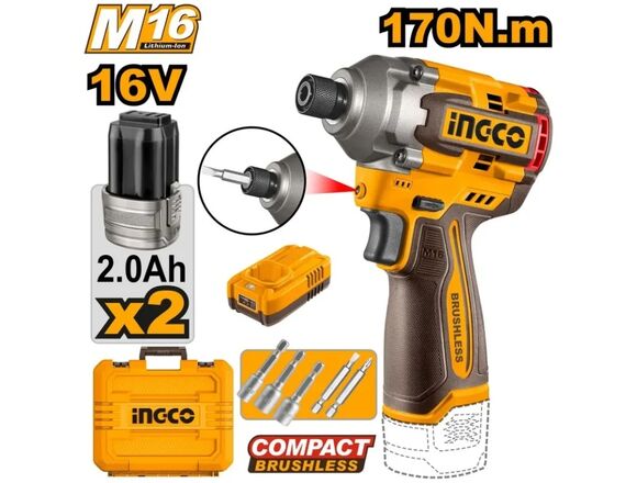 Винтоверт Б/Щ УДАРНЫЙ "M16" INGCO INDUSTRIAL 170Нм 1/4", 2АКБ*2Ач, КЕЙС (5/50)