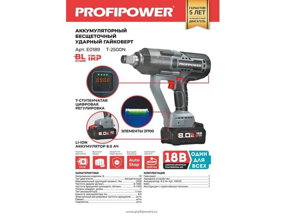 Гайковерт Б/Щ УДАРНЫЙ "ONE-MK" PROFIPOWER 1" 18В, 2500Нм, АКБ1*8Ач+З/У, КЕЙС (1/5)