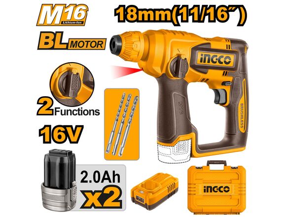 Перфоратор Б/Щ "M16" INGCO INDUSTRIAL 16В, 1,8Дж, 2АКБ*2Ач+ЗУ, буры, КЕЙС (1/4)