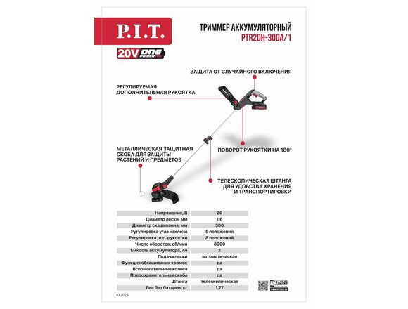 Триммер OnePower Б/Щ P.I.T. 20В Ø300мм, леска 1,6мм*5м, 1АКБ*2Ач+ЗУ, ТЕЛЕСКОП