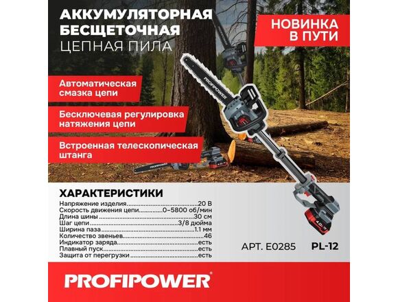 Пила цепная Б/Щ "ONE-MK" PROFIPOWER с штангой ТЕЛЕСКОП 20В, шина 300мм, АКБ2*4Ач