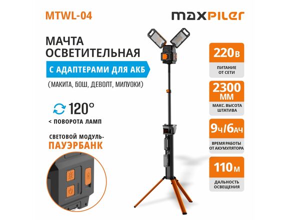 Мачта осветительная MAXPILER 7000лм, 2300мм (4 платформы под АКБ), МАГНИТ/КРЮК + АКБ/ЗУ в подарок