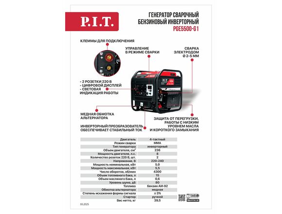 Генератор бензиновый ИНВЕРТОРНЫЙ P.I.T. ОТКРЫТЫЙ сварочный 5,5/5,0кВт 236см³ 4Т, 2*220В, сварка ММА