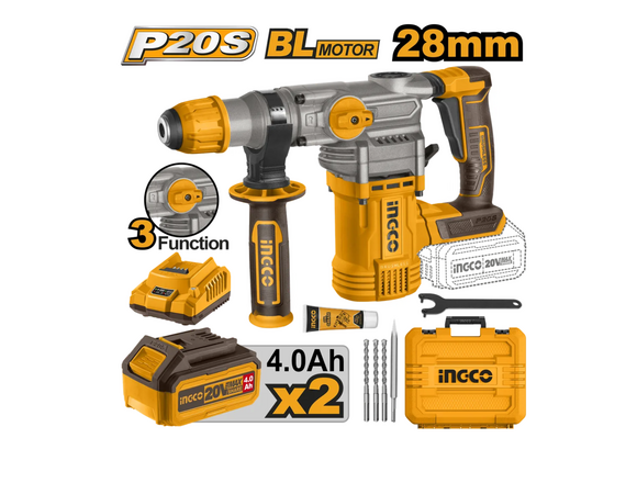 Перфоратор Б/Щ "20V MAX" INGCO INDUSTRIAL 4,5Дж/3реж, 2АКБ*4Ач+ЗУ*4Ач,КЕЙС (1/2)