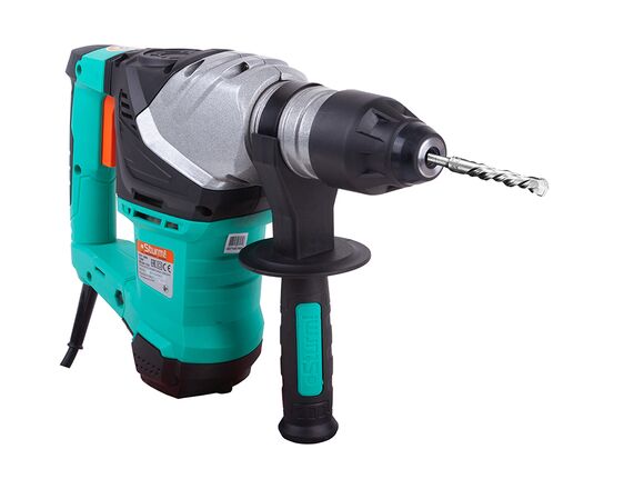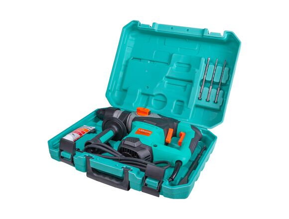 Перфоратор оснащен системой SDS-plus для быстрой и удобной смены бура и пылезащитным колпачком для продления срока службы инструмента.