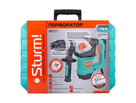 Перфоратор Sturm RH2517 - инструмент мощностью 1700 Вт. Благодаря мощному ударному механизму можно выполнять сверлильные работы не только в стали и дереве, но и в бетоне. Перфоратор работает в трех режимах.