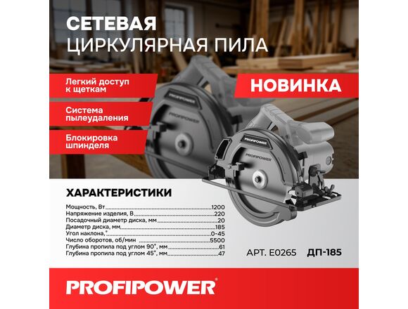Пила циркулярная PROFIPOWER 1,2кВт 185*20мм до 61мм (ДП-185) (1/4)