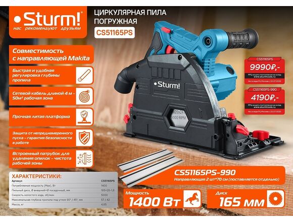 Циркулярная пила Sturm CS51165PS – мощный и удобный электроинструмент для выполнения прямых пропилов, в том числе с погружением, в заготовках из дерева и пластмассы.
