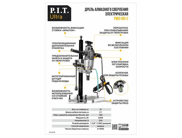 Дрель алмазного сверления P.I.T. ULTRA 2300Вт, 0-1600 об/мин, до ⌀180мм,