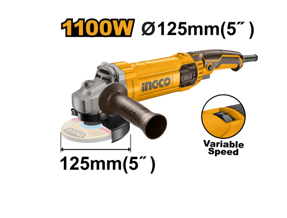 УШМ INGCO INDUSTRIAL 125мм, 1100Вт, удлинённая ручка, рег-ка 4000-12000об/мин (1/6)