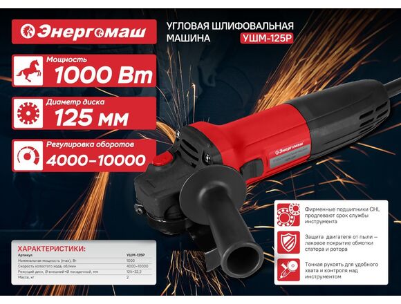 УШМ ЭНЕРГОМАШ 125мм, 1000Вт, рег-ка 4000-10000об/мин, ТОНКАЯ РУКОЯТЬ (1/6)