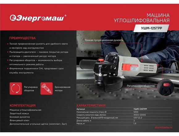 УШМ ЭНЕРГОМАШ 125мм, 1200Вт, тонкая рукоять, рег-ка 4500-12000об/мин (1/6)