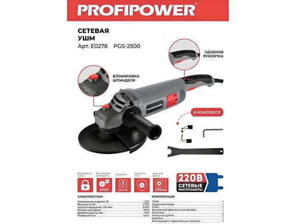УШМ PROFIPOWER 230мм 2,5кВт 6600об/мин плавный пуск (1/2)