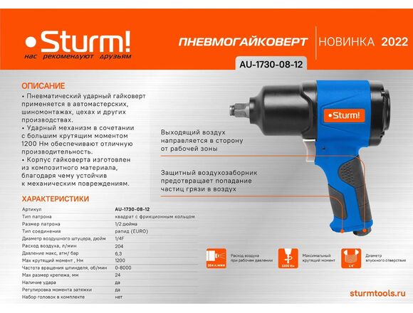 Пневматический инструмент Sturm AU-1730-08-12 применяется в автомастерских, шиномонтажах, цехах и других производствах.