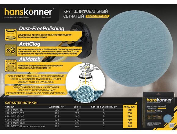 Круг абразивный под липучку сетчатый ПРОФИ HANSKONNER 225мм*5шт, зерно P180 (1/10)
