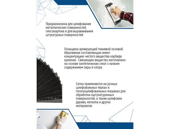 Сетка абразивная vertextools 12900-150 является сменным элементом для ручных терок и плоскошлифовальных машин. Применяется для первичной, промежуточной и финишной обработки шпатлевок, оштукатуренных поверхностей, стыковых швов гипсокартонных плит, а также металлических и деревянных деталей и заготовок.