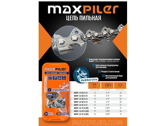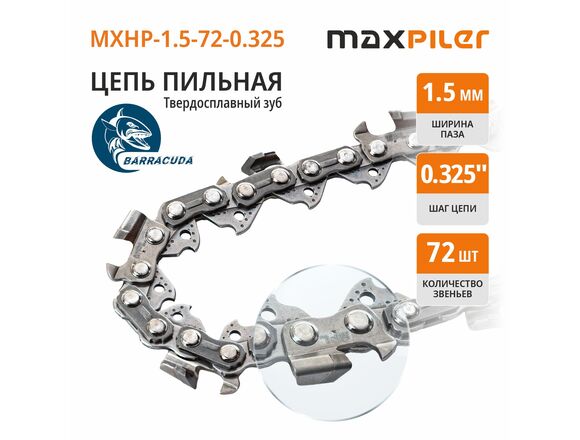 Цепь пильная с ПОБЕДИТОВОЙ напайкой MAXPILER PROF BARRACUDA 72зв 0,325 1,5мм МЕТАЛЛ БОКС