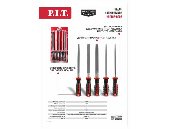 Набор напильников P.I.T.№2 5шт, 300/200мм, 2-я насечка ручка 2К