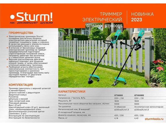 Электротриммер STURM 1600Вт, ВЕЛОРУЧКА, плавный пуск, нож/леска(1/2)
