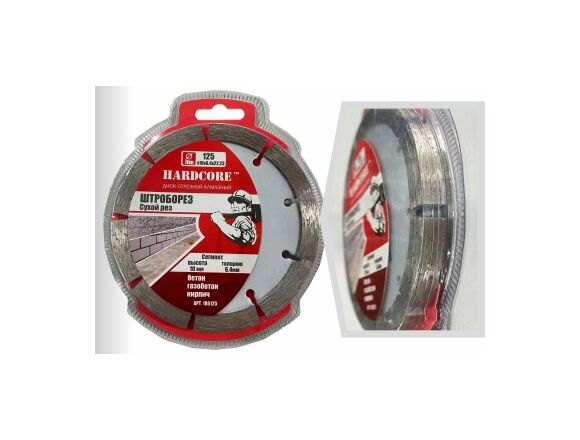 Диск отрезной алмазный сухой рез ГЛУБОКОРЕЗ 125х22.23 мм Hardcore 185125 применяется для глубоких прорезов в бетоне, железобетоне, кирпиче, камне. Алмазный слой заходит внутрь корпуса диска и предохраняет его от истирания при глубоком резе материала. Углублённые многочисленные наклонные промежутки между сегментами обеспечивают улучшенный вывод шлама, который иначе негативно сказывается на сроке службы диска.