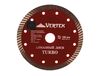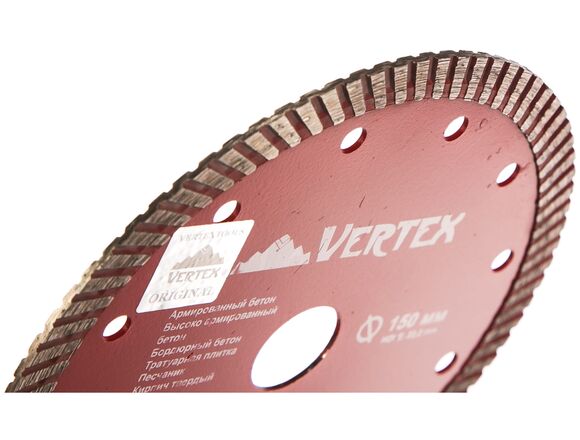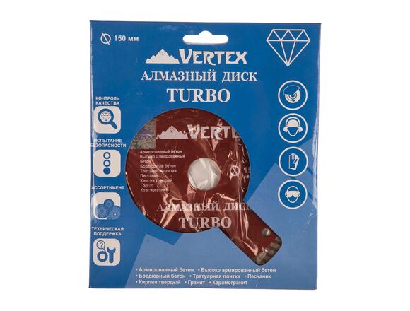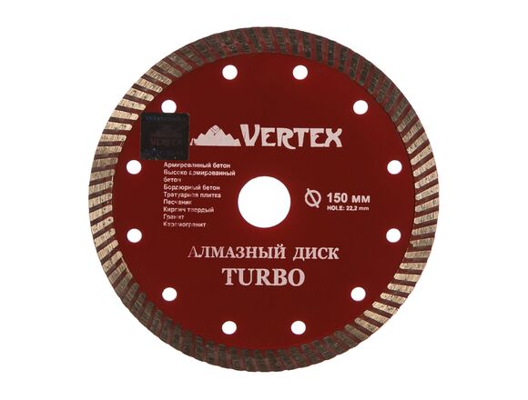 Диск алмазный турбо Vertextools 04-150-22 предназначен для резки бетона, кирпича, натурального и искусственного камня с помощью угловой шлифовальной машины. Турбированная конструкция диска и наличие компенсационных отверстий обеспечивают эффективный отвод пыли из зоны реза, высокую производительность и скорость обработки. Основание оснастки изготовлено из качественной инструментальной стали. Абразивный материал состоит из синтезированных алмазов (более 30%) и оксидов цветных металлов, природных материалов и стали. Диск имеет длительный рабочий ресурс.