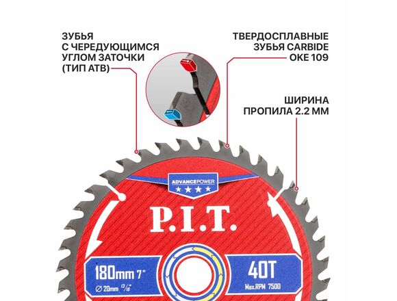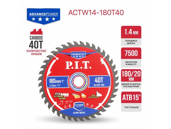 Диск пильный по дереву P.I.T. ADVANCE 180*20*1,4мм, 40T Carbide, зуб ATB 15° б/у дер с гвоздями