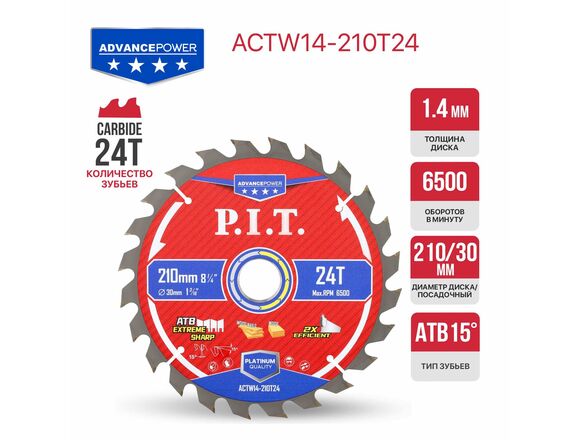 Диск пильный по дереву P.I.T. ADVANCE 210*30*1,4мм 24T Carbide, зуб ATB 15° б/у дер с гвоздями