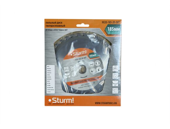 Диск пильный (185x20 мм; 36 зубьев; переходное кольцо 16 мм) Sturm 9020-185-20-36T применяется для продольного и поперечного распила мягкой и твердой древесины, фанеры, ДСП, ламината, пластика и плитных материалов. Твердосплавные напайки из карбид вольфрама BK8 обеспечивают высокий рабочий ресурс. Усиленный и закаленный корпус изготовлен из стали 50.