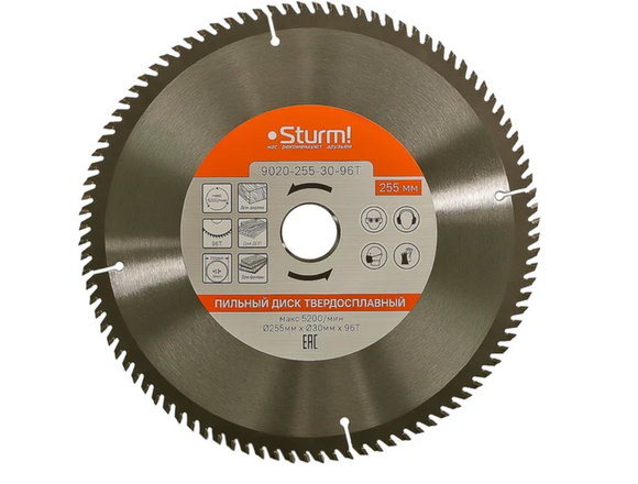 Диск пильный 255х30 мм, 96T Sturm 9020-255-30-96T применяется для продольного и поперечного распила мягкой и твердой древесины, фанеры, ДСП, ламината, пластика и плитных материалов.