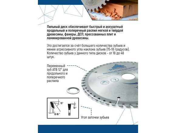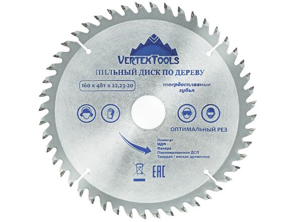 Пильный диск по дереву Vertextools 160-48-22 предназначен для выполнения точных продольных и поперечных чистовых пропилов в мягкой и твердой древесине, прессованной слоистой древесине, фанере, ламинате и ДСП. Напаянные индуктивным способом твердосплавные переменные зубья с агрессивным углом резания обеспечивают одновременно быстрое и точное пиление. Чистота распила зависит от количества зубьев и расстояния между ними. Чем больше зубья, тем чище распил. Основа выполнена из углеродистой стали, напайки на зубах из карбидно-вольфрамового сплава (победита).
