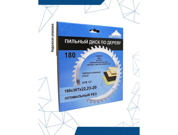 Пильный диск по дереву Vertextools 180-36-22 предназначен для выполнения точных продольных и поперечных чистовых пропилов в мягкой и твердой древесине, прессованной слоистой древесине, фанере, ламинате и ДСП. Напаянные индуктивным способом твердосплавные переменные зубья с агрессивным углом резания обеспечивают одновременно быстрое и точное пиление. Чистота распила зависит от количества зубьев и расстояния между ними. Чем больше зубья, тем чище распил. Основа выполнена из углеродистой стали, напайки на зубах из карбидно-вольфрамового сплава (победита).