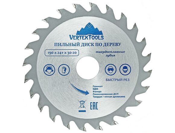 Пильный диск по дереву Vertextools 190-24-30 предназначен для выполнения точных продольных и поперечных чистовых пропилов в мягкой и твердой древесине, прессованной слоистой древесине, фанере, ламинате и ДСП. Напаянные индуктивным способом твердосплавные переменные зубья с агрессивным углом резания обеспечивают одновременно быстрое и точное пиление. Чистота распила зависит от количества зубьев и расстояния между ними. Чем больше зубья, тем чище распил. Основа выполнена из углеродистой стали, напайки на зубах из карбидно-вольфрамового сплава (победита).