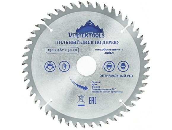 Пильный диск по дереву Vertextools 190-48-30 предназначен для выполнения точных продольных и поперечных чистовых пропилов в мягкой и твердой древесине, прессованной слоистой древесине, фанере, ламинате и ДСП. Напаянные индуктивным способом твердосплавные переменные зубья с агрессивным углом резания обеспечивают одновременно быстрое и точное пиление. Чистота распила зависит от количества зубьев и расстояния между ними. Чем больше зубья, тем чище распил. Основа выполнена из углеродистой стали, напайки на зубах из карбидно-вольфрамового сплава (победита).