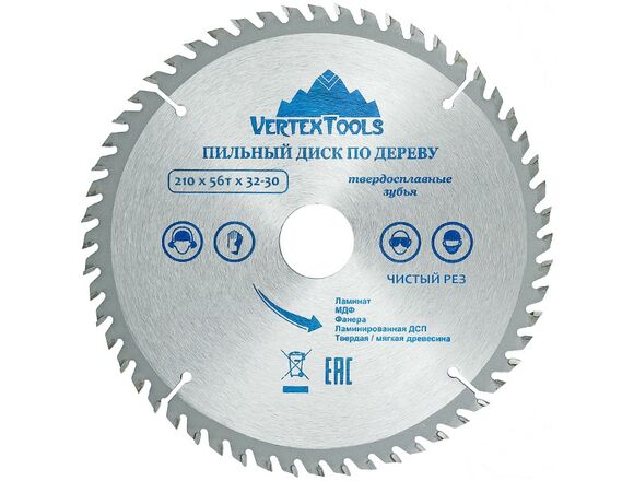 Пильный диск по дереву Vertextools 210-56-32 предназначен для выполнения точных продольных и поперечных чистовых пропилов в мягкой и твердой древесине, прессованной слоистой древесине, фанере, ламинате и ДСП. Напаянные индуктивным способом твердосплавные переменные зубья с агрессивным углом резания обеспечивают одновременно быстрое и точное пиление. Чистота распила зависит от количества зубьев и расстояния между ними. Чем больше зубья, тем чище распил. Основа выполнена из углеродистой стали, напайки на зубах из карбидно-вольфрамового сплава (победита).