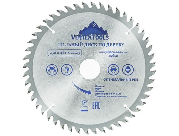 Диск пильный по дереву (230х22.23 мм; 48 зубов) Vertextools 230-48-22 предназначен для выполнения точных продольных и поперечных чистовых пропилов в мягкой и твердой древесине, прессованной слоистой древесине, фанере, ламинате и ДСП.