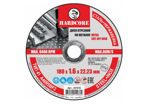 Круг отрезной по металлу и нержстали HARDCORE 180*1,6*22,2мм (5/25/200 )