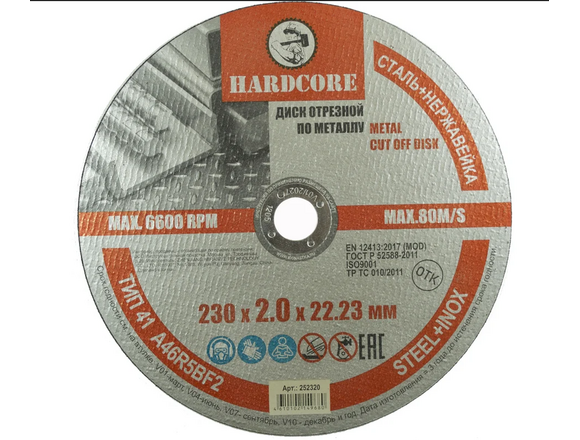 Круг отрезной по металлу и нержстали HARDCORE 230*2,0*22,2мм (5/25/100 )
