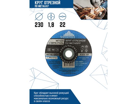 Круг отрезной по металлу 230x1.8x22 мм vertextools 230-1,8-22 позволяет эффективно пилить листы из черного и цветного металла, резать металлические профили и трубы.Режущая часть изготовлена из кристаллов оксида алюминия. Для повышенной прочности круг содержит стекловолоконные сетки с многослойным армированием. Выдерживает продолжительную эксплуатацию и соответствует требованиям техники безопасности.Режущая часть изготовлена из кристаллов оксида алюминия. Для повышенной прочности круг содержит стекловолоконные сетки с многослойным армированием.Круг отрезной обладает замечательным режущими свойствами, которые были выработаны благодаря абразивуКруги отрезные применяются на УШМ для резки металлических деталей и заготовок, строительной арматуры и других материалов.