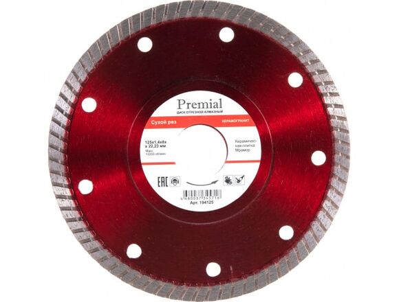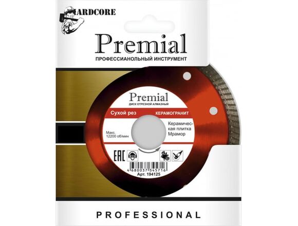 Диск алмазный отрезной сплошнойPremial КерамогранитHardcore 194125 тонкий 1,2мм с увеличенным сегментом режущего слоя 10мм предназначен для угловых шлифовальных машин. Применяется для сухой резки мрамора, керамограниту и керамической плитки.