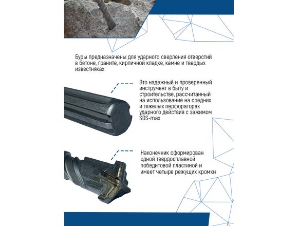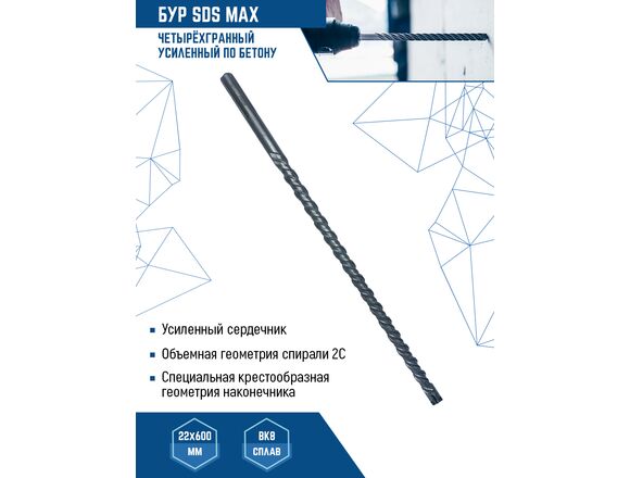 Бур SDS MAX 22x600 мм vertextools 888-22-600 используется в перфораторах с системой крепления SDS-max. Применяется для работ по бетону, граниту, кирпичной кладке и твердым известнякам.