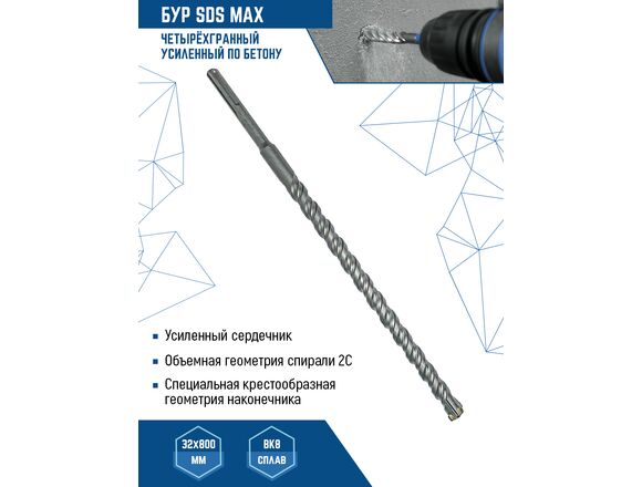 Бур SDS MAX 32x800 мм vertextools 888-32-800 используется в перфораторах с системой крепления SDS-max. Применяется для работ по бетону, граниту, кирпичной кладке и твердым известнякам.