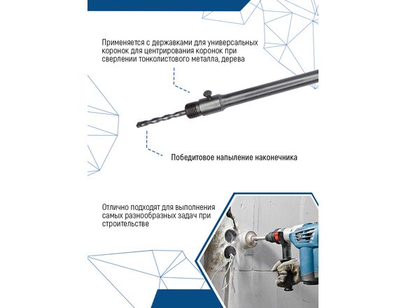 Хвостовик SDS-plus 20x450 мм vertextools 213-450 изготовлен из легированной инструментальной стали и выдерживает нагрузки, возникающие при сверлении отверстий коронками в бетоне. Используется совместно с буровыми коронками для надежной фиксации. Центрирующее сверло надежно крепится в держателе. Резьбовое соединение М22 фиксируется по вращению.
