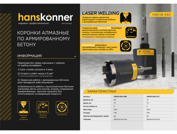 Коронка алмазная по железобетону HANSKONNER 68*80 мм, 5 сегментов (5/20)