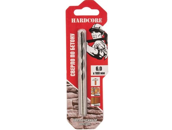 Сверло по бетону (6x100 мм) Hardcore 130006 оснащено твердосплавными напайками высокой твердости и прочности. Оснастка прошла термическую закалку, что обеспечивает высокую твердость сверла и позволяет сохранять прямую геометрию в работе. Имеет достаточно глубокую Н-образную канавку для облегчённого вывода пыли.