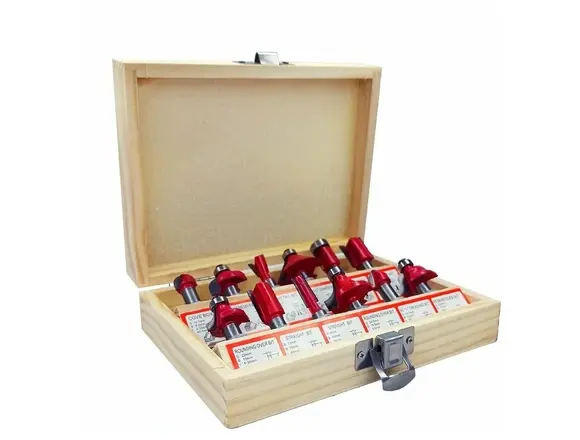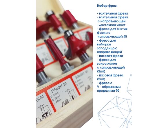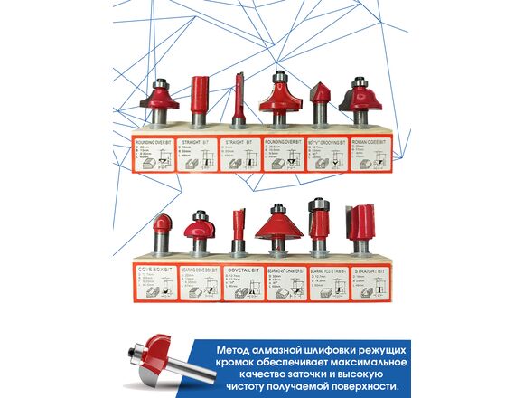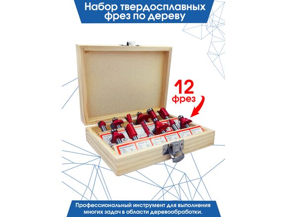 Набор твердосплавных фрез по дереву 12 шт vertextools 05-05-0512 используется для фигурного фрезерования дерева. Подходит для ДСП, МДФ, лиственных и хвойных пород.