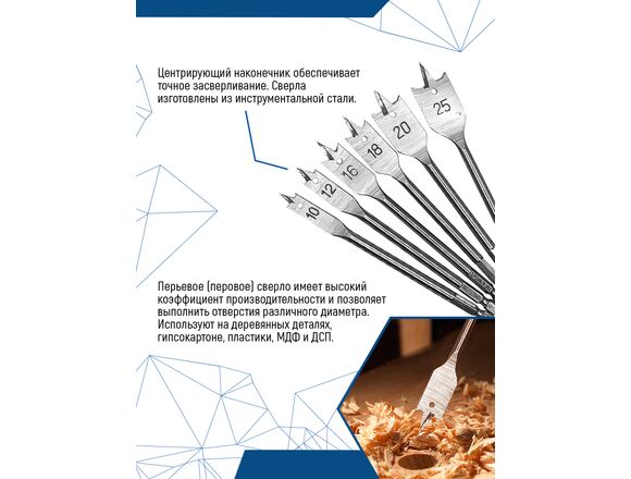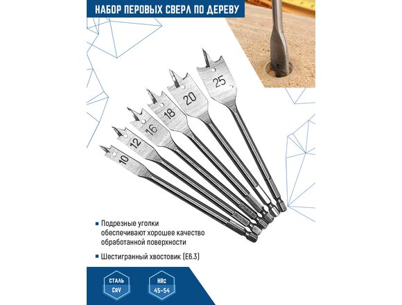 Набор сверл перовых с удлинителем 300 мм vertextools 0282-07 используется совместно с дрелями для сверления отверстий в заготовках из древесины, фанеры, ДСП.
